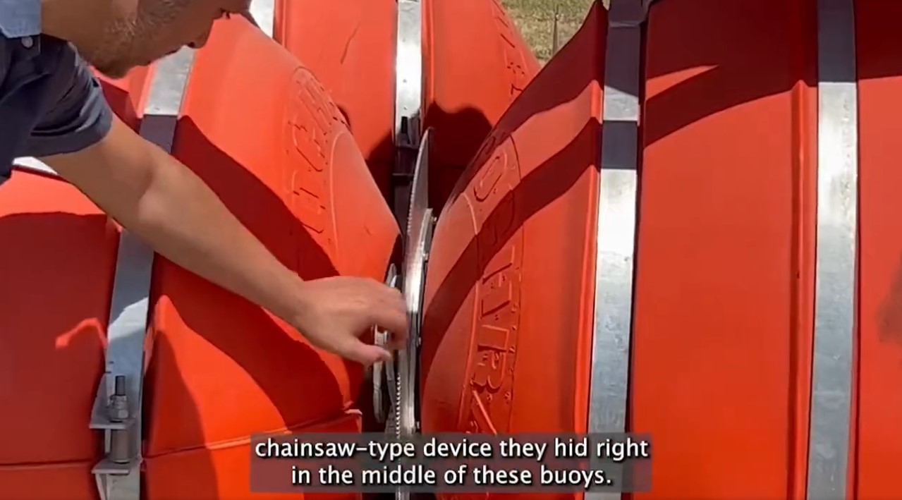 En las redes sociales se publican imágenes que muestran que entre cada boya hay una sierra metálica con pequeñas puntas afiladas.