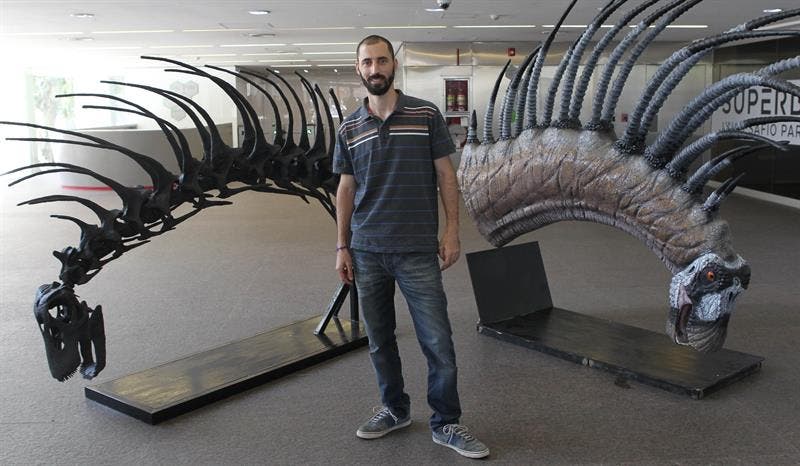El paleontólogo Pablo Gallina posa junto a las maquetas del Bajadasaurus pronuspinax.
