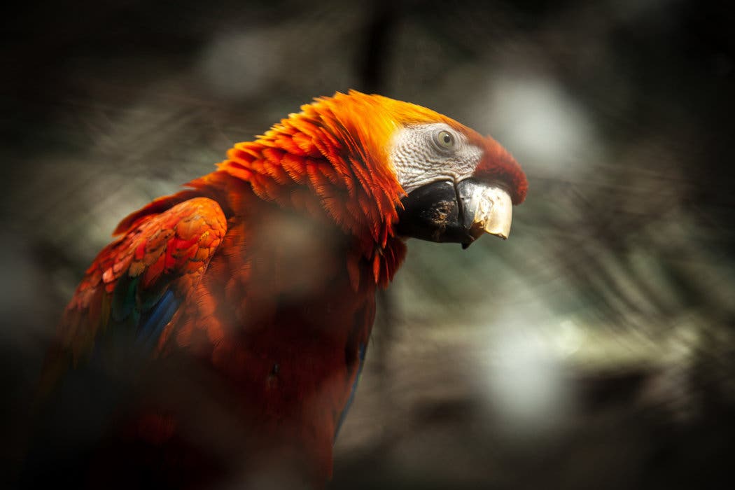 Esta guacamaya en el centro de rehabilitación fue rescatada de traficantes que le cortaron el pico para que no pudiera defenderse. Crédito: Iván Valencia