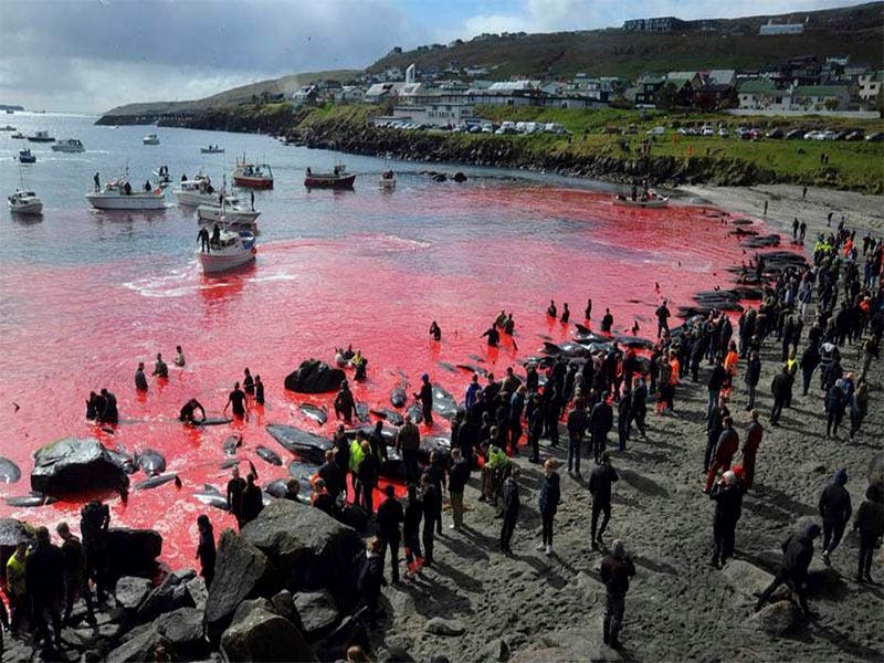 El mar de las islas Feroe se pintó de rojo debido a que los habitantes realizaron una vez más su tradicional matanza de ballenas y delfines.