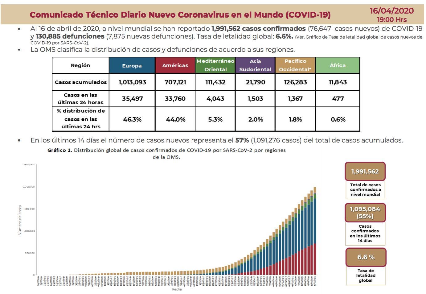 El mundo a horas de los dos millones de infectados por Coronavirus.- Cuando Mexico ya se encuentra prácticamente dentro de la Fase 3 de la pandemia de Coronavirus Covid-19, que según lo que especialistas han informado seria la etapa mas critica del contagio, el mundo se encuentra apenas a unos cuantos casos de rebasar la barrera de los dos millones de casos confirmados, siendo ya 1 millón 991 mil 562 reportados y mas de 130 mil defunciones, según los datos que maneja la Organización Mundial De la Salud hasta el corte de las 19:00 horas de este jueves, aunque datos de Channelnewasia.com, quienes fueron los primeros en llevar un conteo confiable, ponen ya la cifra en 2 millones 143 mil 654 casos confirmados alrededor del mundo hasta hoy.