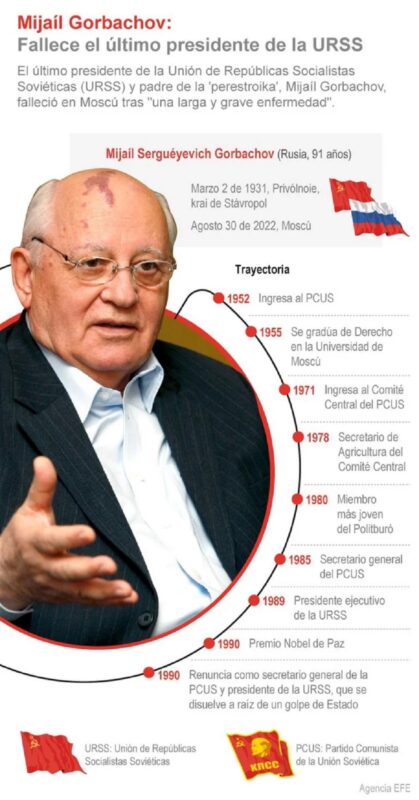 Hasta su dimisión en 1991, que marcó el fin del bloque, llevó a cabo importantes reformas democráticas, conocidas como la “perestroika” (reestructuración) y “glasnost” (transparencia).