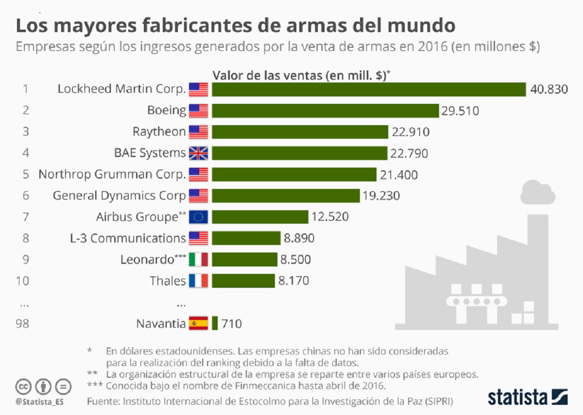 El listado, por mayor volumen de ventas, lo componen Lock-heed Martin Corp (EU), Raytheon Technologies (EU), Boeing (EU), Northrop Grumman (EU), General Dynamics (EU), BAE Systems (Reino Unido), Norinco (China), AVIC (China), L3Harris Technologies (EU), Airbus (Países Bajos), Leonardo (Italia), Thales (Francia), Huntington Ingalls Industries (EU), Leidos Holdings (EU) y Honeywell International (EU).