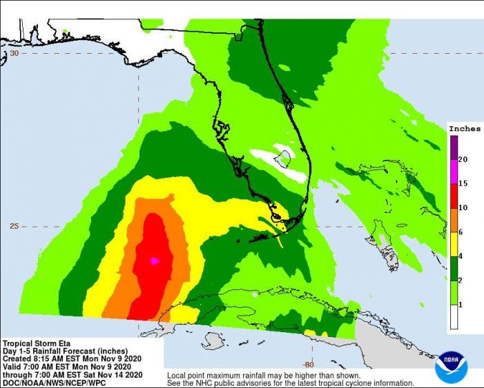 El lento avance del sistema y sus fuertes lluvias son una enorme amenaza para el sur de Florida, una zona ya anegada por más de 14 pulgadas de lluvia el mes pasado. ‘Eta’ podría descargar de 6 a 12 pulgadas más de agua en la región, según los expertos.