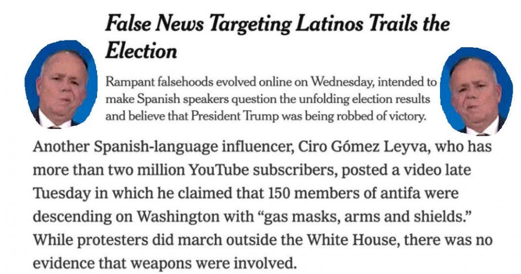 Agrega: “Los mensajes infundados de las redes sociales a los latinos que intentan deslegitimar la elección y los resultados de Joseph R. Biden Jr. circularon en línea el martes por la noche y hasta el miércoles, como parte de una campaña de desinformación para socavar la confianza de los latinos en la votación a medida que se desarrollaba”.