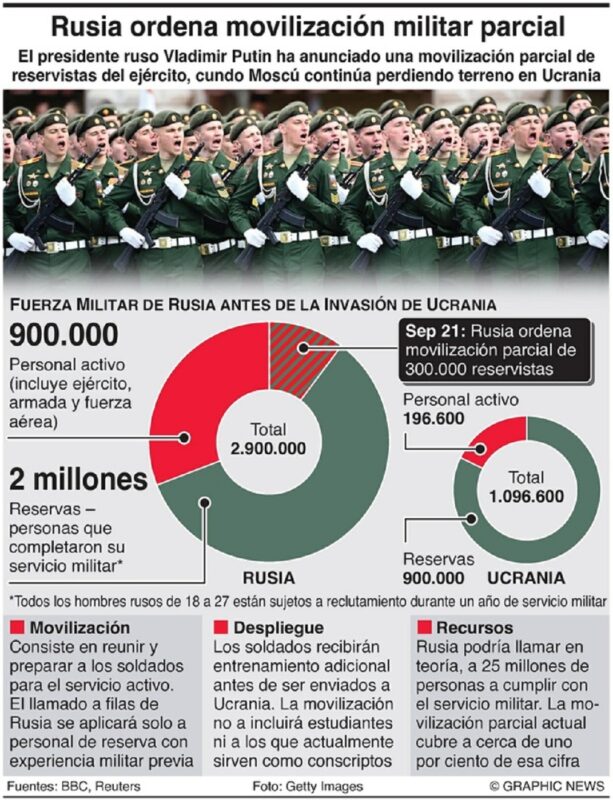 La movilización afectó inicialmente a 300 mil reservistas, pero, según el ministerio de Defensa, un total de 25 millones de rusos son movilizables para unirse a las filas del ejército en el este y el sur de Ucrania.