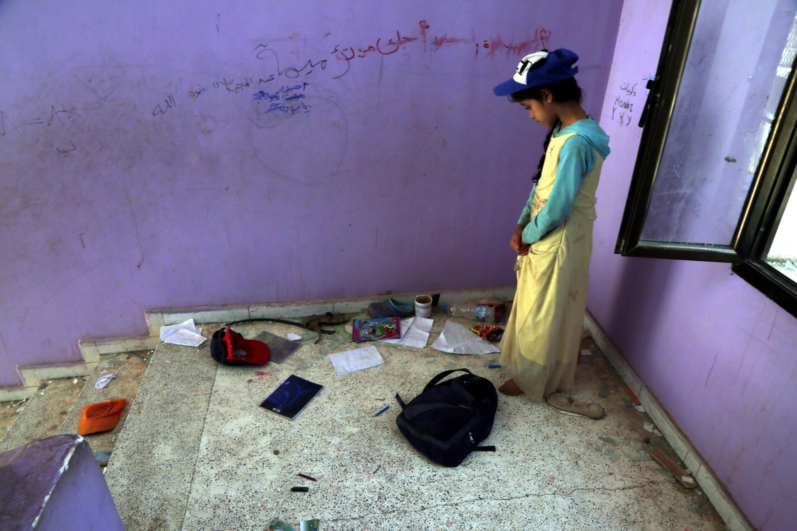 Varias mochilas y pertenencias esparcidas por el suelo de una escuela evacuada por un bombardeo en Saná capital de Yemen.