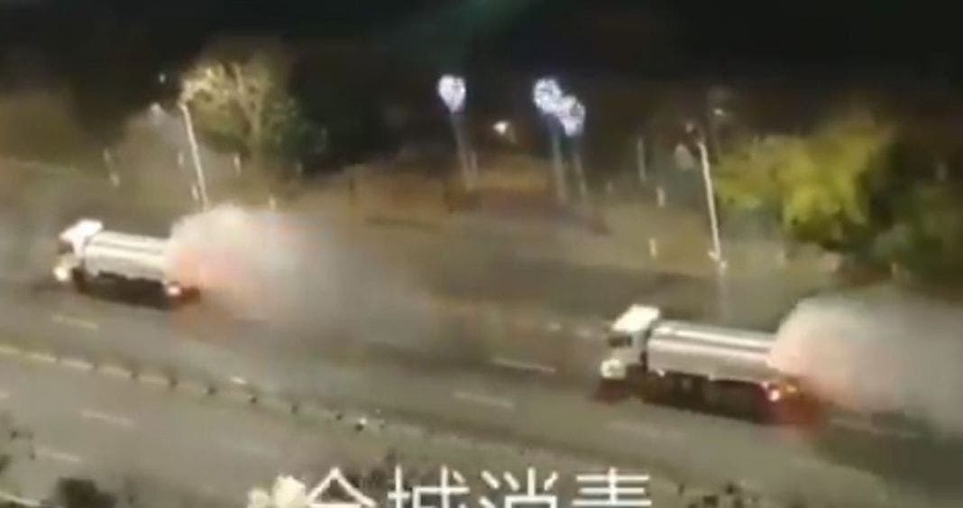 Un video difundido a través de las redes sociales muestra al menos a cinco camiones que rocían un químico utilizado supuestamente para eliminar todo rastro de coronavirus en las calles de Wuhan, China.
