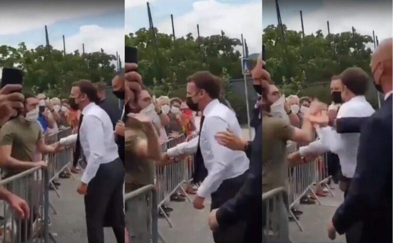 En las imágenes que circularon por las redes puede verse como el presidente francés se acerca a una valla donde había gente esperándolo. Saluda a una persona que mientras sostiene su brazo con su mano izquierda, con la derecha le atesta una cachetada.