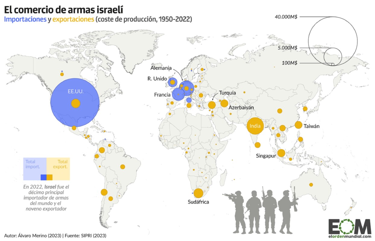 En octubre de 2023, Estados Unidos tenía 599 casos activos con Israel de Ventas Militares Exteriores, las FMS, valorados en 23 800 millones de dólares.