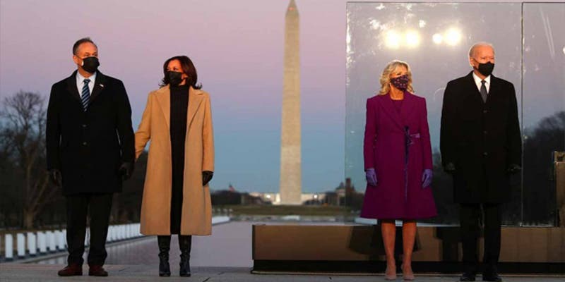 Joe Biden y Kamala Harrris encabezaron la ceremonia para recordar a las víctimas de la pandemia por Covid-19 que se realizó cerca del Capitolio.