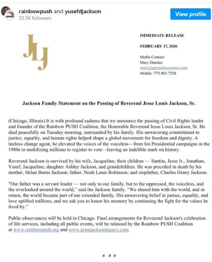 “Con profunda tristeza anunciamos el fallecimiento del líder de los Derechos Civiles y fundador de la Coalición Rainbow PUSH, el Honorable Reverendo Jesse Louis Jackson”, señaló la familia en el mensaje publicado en Instagram. En el mismo texto precisaron que murió “rodeado de su familia”, sin detallar las causas.