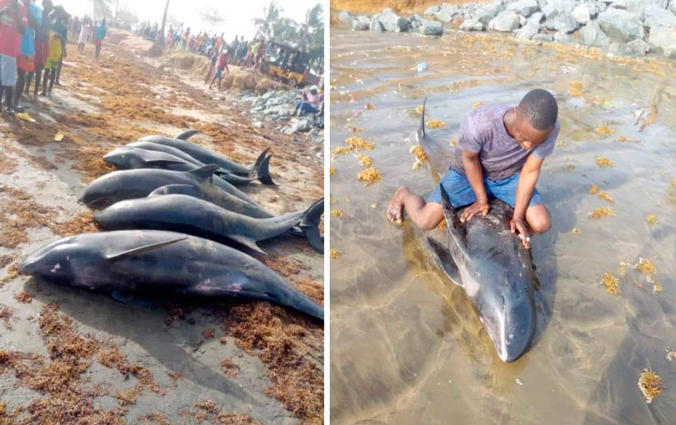 «Contamos 60 delfines muertos y también pequeños peces. Es extraño y no se puede decir realmente lo que sucedió, probablemente en alta mar, para que especies como estas encallaran aquí», declaró a la prensa Samuel Obeng, un pescador local.
