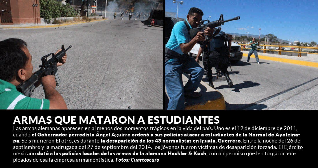 Las armas alemanas aparecen en al menos dos momentos trágicos en la vida del país. Uno es el 12 de diciembre de 2011, cuando el Gobernador perredista Ángel Aguirre ordenó a sus policías atacar a estudiantes de la Normal de Ayotzinapa que bloqueaban la Autopista del Sol. Seis murieron.