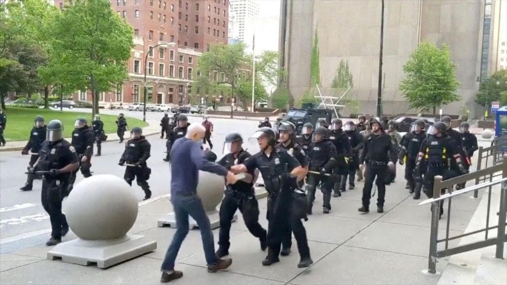 El video tomado por un periodista de la estación de radio pública local WBFO y publicado en su sitio web y cuenta de Twitter muestra al hombre de cabello blanco acercándose a una línea de oficiales con equipo antidisturbios. Un oficial lo empuja con un bastón y otro con la mano. Se escucha el golpe y luego la sangre empieza a derramarse de la cabeza del hombre. El hombre, que es blanco, aún no ha sido identificado.