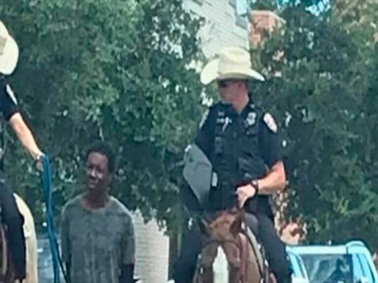 Policías a caballo llevan a hombre negro atado con una cuerda.- La imagen de un hombre negro que fue arrestado en Estados Unidos está causando indignación en las redes sociales, debido a la forma en la que es trasladado.
