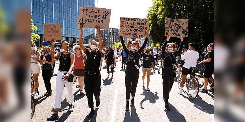 Los manifestantes desafiaron la cuarentena por Covid-19 para reunirse con pancartas en donde se podía leer «Black Lives Matter» (las vidas negras importan), eslogan que más se ha oído en las protestas de Estados Unidos por la muerte del ciudadano.