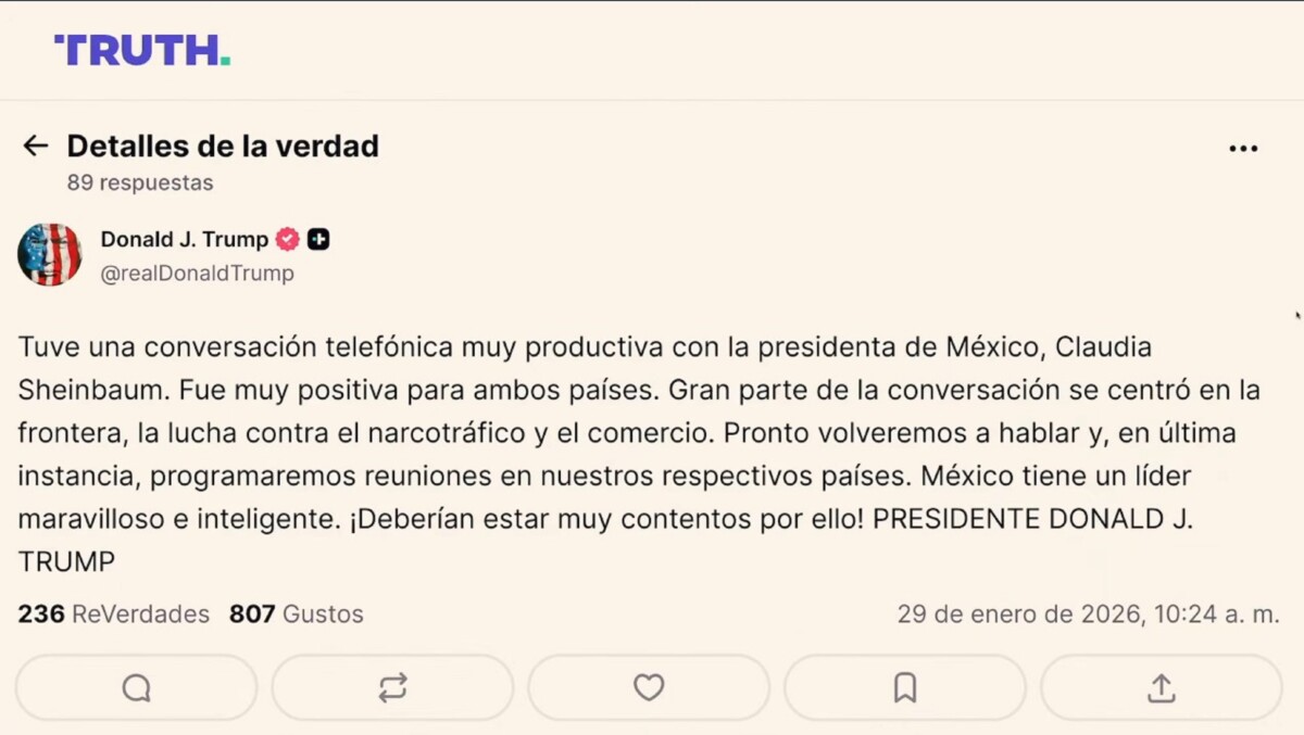 Por su parte, el presidente de Estados Unidos, Donald Trump, publicó un mensaje a través de su red Truth, @realDonaldTrump , al que la Presidenta Sheinbaum Pardo dio lectura antes de concluir la Mañanera del Pueblo del día de ayer y que decía a la letra: