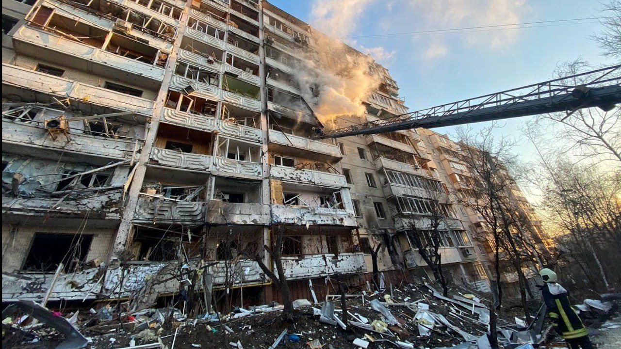 Durante el ataque a Kiev, explosiones cimbraron la ciudad y salían llamas de las ventanas de al menos dos edificios —incluyendo uno residencial— en la capital, la cual había estado relativamente incólume en las últimas semanas. Era posible ver columnas de humo en distintos puntos de la urbe.