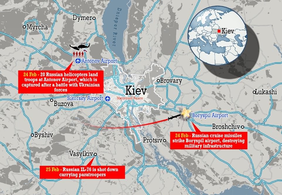 Los informes del mando ucraniano parecieran confirmarse tras un informe del Ministerio de Defensa de Gran Bretaña, quien dijo que las fuerzas rusas se están moviendo hacia Kiev desde múltiples direcciones, en un intento de rodear la ciudad.