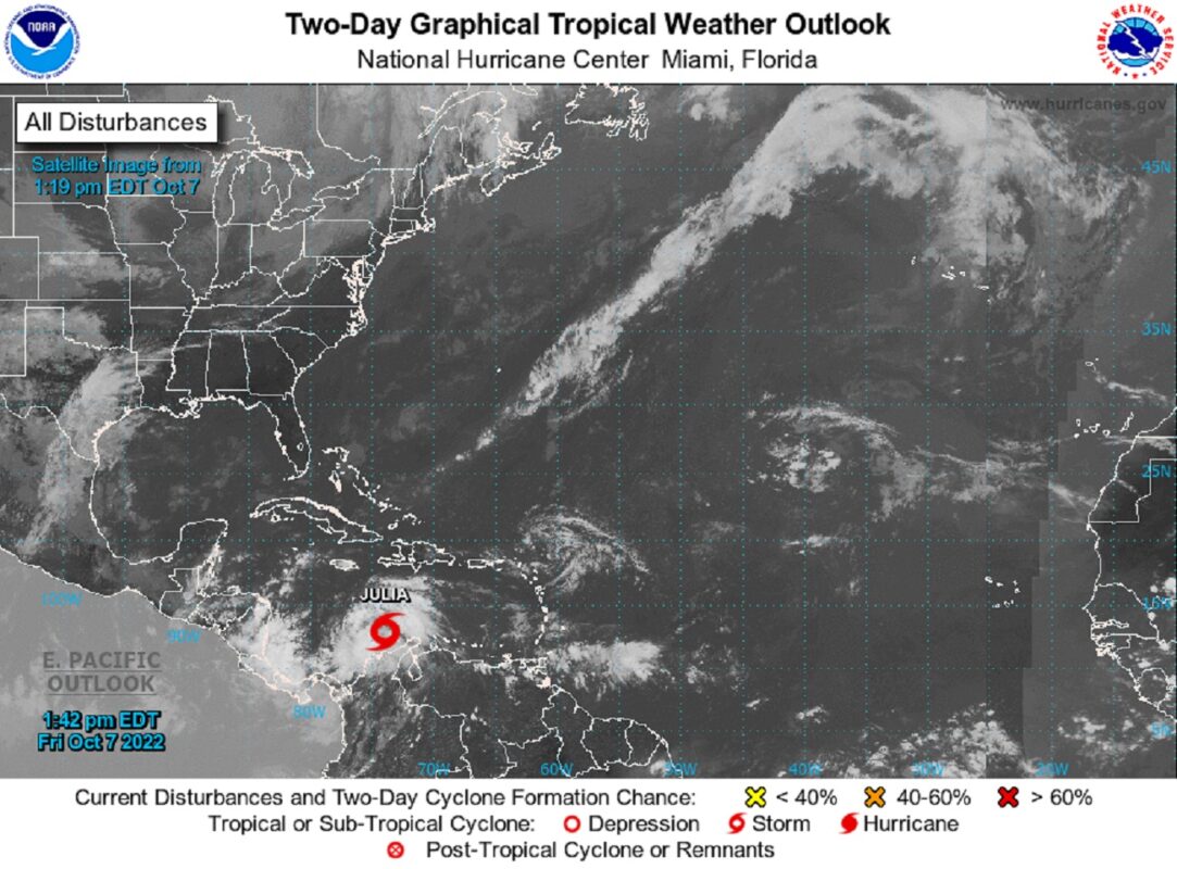 La Comisión Nacional del Agua (Conagua) informó que se formó la Tormenta Tropical “Julia” al sureste del Mar Caribe, cerca de Quintana Roo, con un desplazamiento hacia el oeste a 24 kilómetros por hora.
