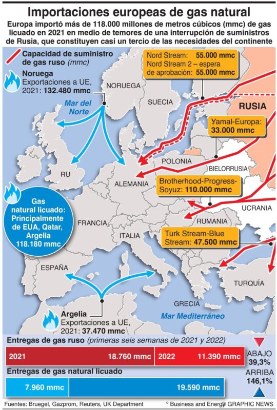 Europa ha buscado proveedores alternativos conforme Moscú iba reduciendo el flujo de gas natural a los miembros de la UE, lo que disparó los precios de la energía y aumentó las expectativas de recesión. El bloque de 27 países, que esta semana celebra una reunión de ministros de energía para abordar un límite al precio del gas, se prepara para un posible corte total del gas ruso, aunque ha conseguido llenar sus reservas al 90 por ciento.
