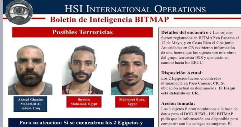 Los señalados serían Ibrahim Mohamed y Mohamed Eissa, ambos egipcios; y Ahamed Ghanim Mohamed Al Juburi, de origen iraquí. El grupo estuvo en Costa Rica el 9 de junio pasado y en Panamá, el 12 de mayo, señaló el boletín.