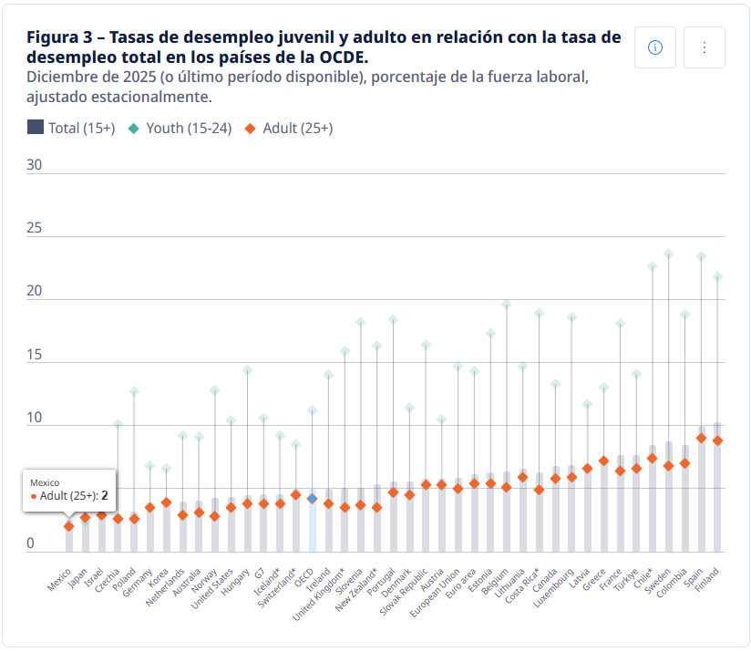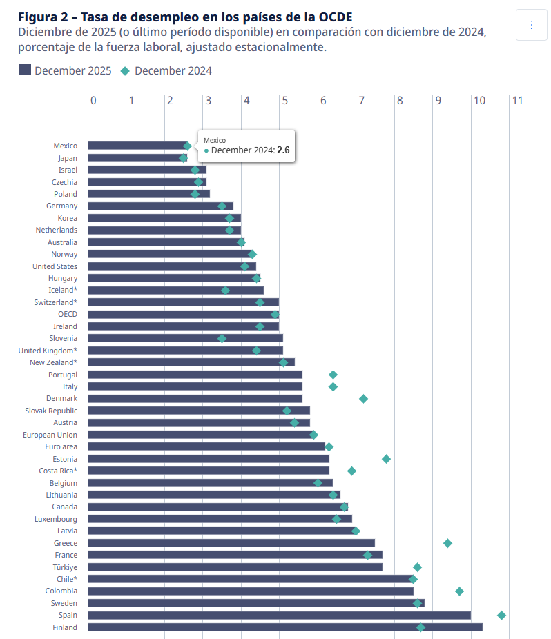 De acuerdo con el informe de la OCDE, titulado “La tasa de desempleo de la OCDE se mantuvo estable en el 5.0% en diciembre de 2025”, el cual fue publicado en febrero de 2026 y fue retomado por la Secretaría del Trabajo y Previsión Social (STPS) este 16 de marzo; México mantuvo una tasa de desempleo de 2.6% en diciembre de 2025.