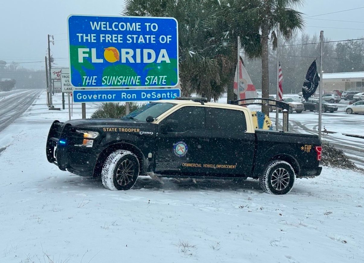 Matt Devitt, jefe de Meteorología de WINK News, publicó un video en la red social X (antes Twitter) en el que pudo verse el paisaje blanco alrededor del cartel que da la bienvenida a Florida.