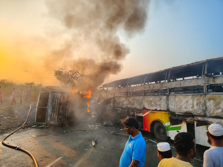 El accidente ocurrió el jueves por la mañana cuando un autobús privado chocó con un camión volquete y se incendió de inmediato.