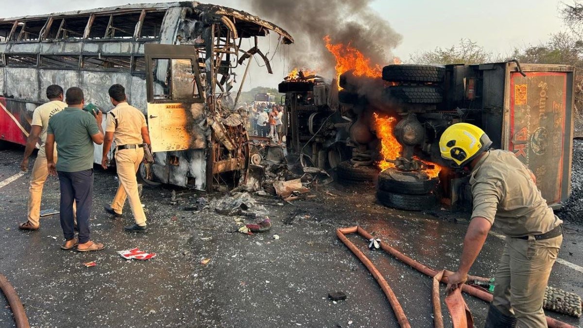 El accidente ocurrió el jueves por la mañana cuando un autobús privado chocó con un camión volquete y se incendió de inmediato.