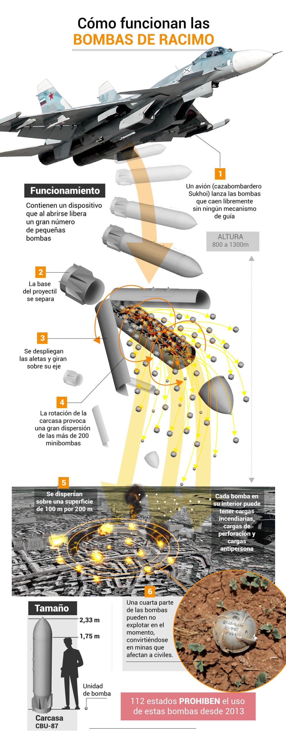 Las municiones en racimo, una clase de arma que comprende cohetes, bombas, misiles, morteros y proyectiles de artillería, se abren en el aire y lanzan bombetas más pequeñas en un área amplia. El peligro para los civiles sigue siendo importante hasta que los expertos localicen y eliminen debidamente las municiones sin estallar. La Convención sobre Municiones en Racimo, que entró en vigor en 2010, prohíbe su uso debido al daño indiscriminado que pueden causar a los civiles. Los grupos humanitarios han señalado que el 20 por ciento o más de las submuniciones antipersonal no detonan al impactar, pero pueden explotar más tarde si son recogidos o manipulados.