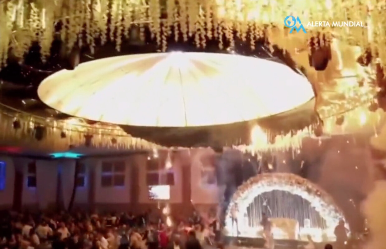 Sin embargo, segundos después de que se accionaran los fuegos artificiales los arreglos y paneles del techo comenzaron a arder en llamas provocando que se desprendieran mientras que los invitados salían agachados huyendo del lugar.