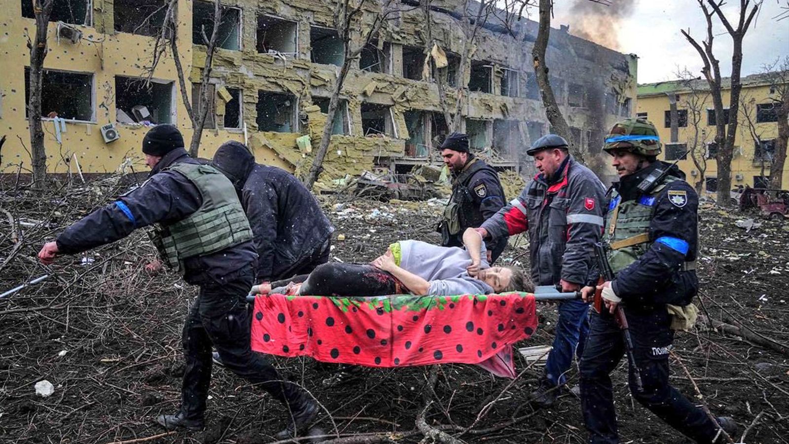 Injured mothers were evacuated on makeshift stretchers, while soldiers cared for children, after Ukrainian officials say a Russian attack destroyed both a children's hospital and maternity ward. pic.twitter.com/qARLrfU6B3