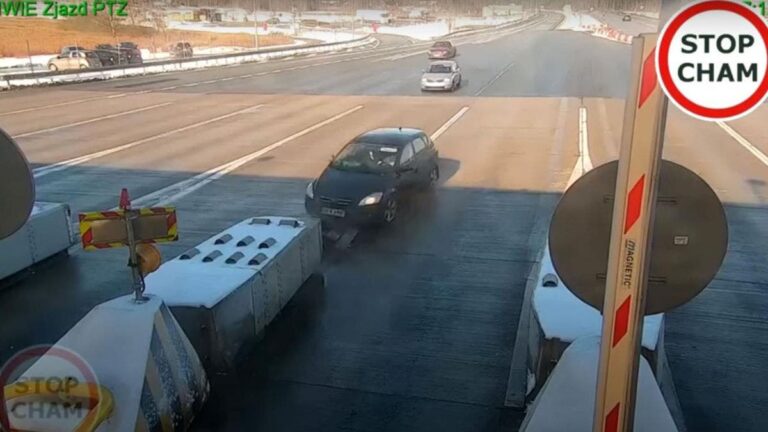 Y es que el choque, quedó grabado por las cámaras de seguridad de una caseta de cobro en Torun, Polonia; grabaron el momento exacto en el que el conductor de un KIA negro se impacta contra una división a toda velocidad.