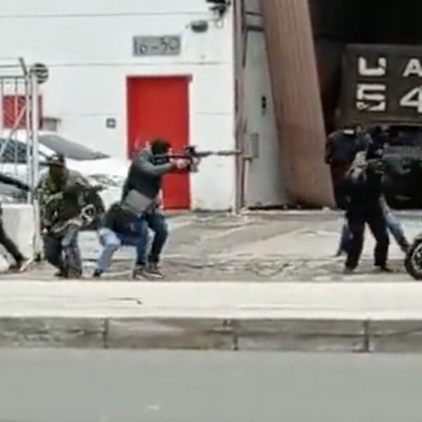 Algunos de los videos muestran el momento en que un nutrido grupo de ladrones armados con fusiles de asalto salen de la bodega, en esos momentos llegan elementos policiacos y se desata una balacera digna de una película.