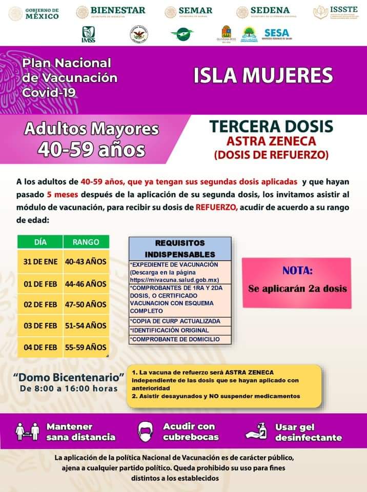 En Isla Mujeres los adultos de 40 a 59 años de edad que ya tengan su esquema de vacunación contra Covid-19 completo podrán recibir esta semana la dosis de refuerzo, siempre y cuando hayan transcurrido cinco meses desde la segunda aplicación.