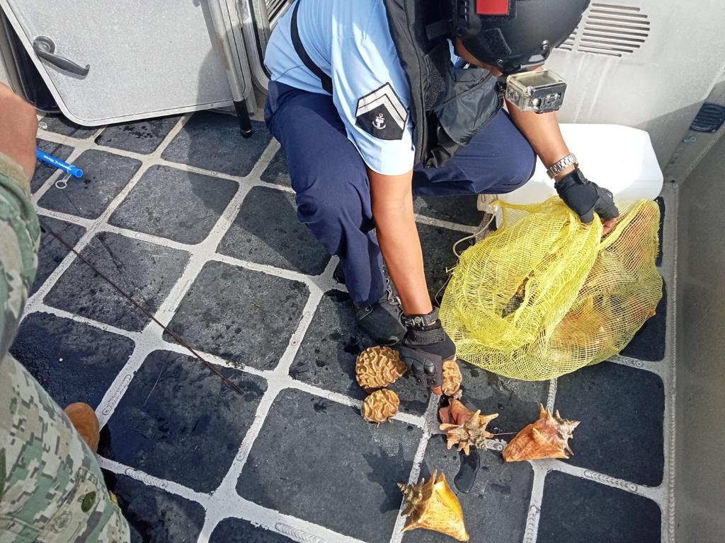 Al abordarlo para efectuarle una revisión de rutina, se le encontraron 13 ejemplares vivos de caracol rosado y cuatro piezas de coral, sin contar con los permisos de pesca correspondientes.