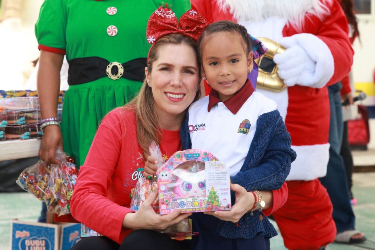 En un ambiente festivo y cercana a los infantes, Atenea Gómez visitó el kínder “Gabriela Mistral” y la primaria “Andrés Quintana Roo” para llevar juguetes y dulces a los pequeñines, reiterando que durante los próximos días recorrerá junto a Santa y los demás personajes navideños, todas las guarderías y escuelas de nivel prescolar y primaria del municipio, en beneficio de 5 mil pequeñines.