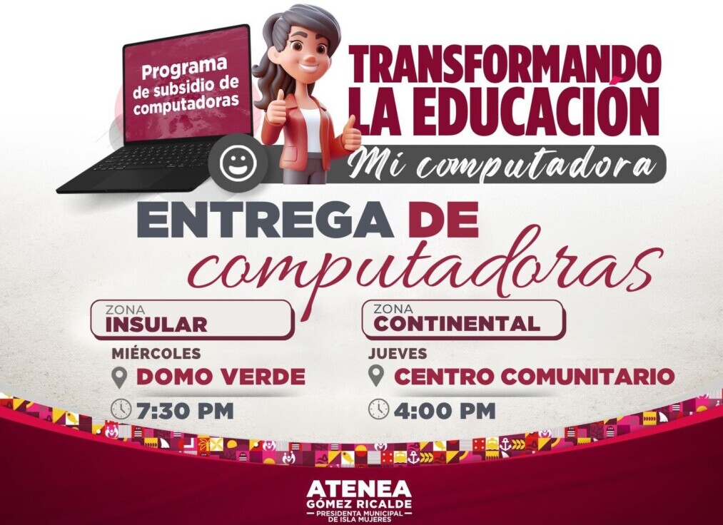 Isla Mujeres.- El Gobierno Municipal, encabezado por la presidenta municipal, Atenea Gómez Ricalde, a través de la Dirección de Educación, anunció que este miércoles y jueves se realizará la entrega de equipos del nuevo Programa de Subsidio de Computadoras.