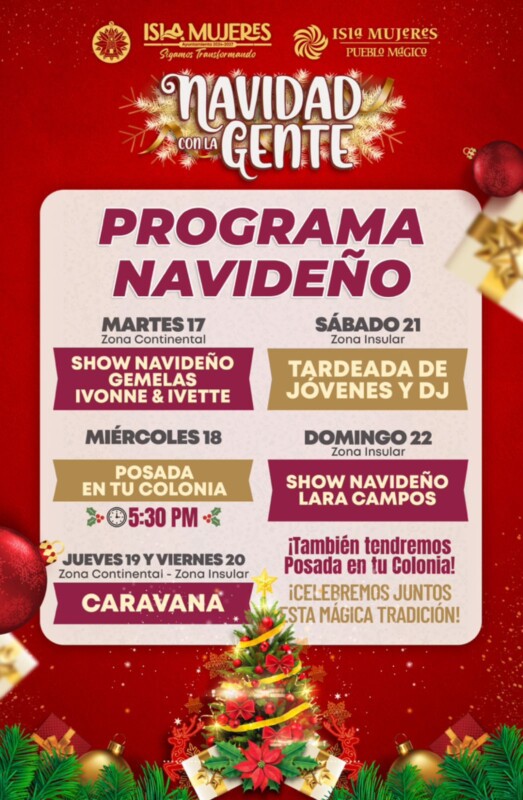 La programación incluye desde el tradicional Encendido del Árbol de Navidad hasta presentaciones artísticas y Caravanas Navideñas, con las cuales se llevará la magia y alegría a las calles de Isla Mujeres.