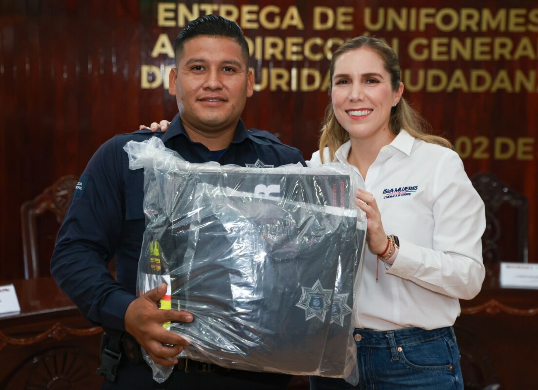 Durante la ceremonia, que se realizó en la Sala de Cabildo, la alcaldesa isleña informó que se entregaron 350 kits de uniformes a las y los elementos de la Dirección General de Seguridad Ciudadana, incluyendo personal de las direcciones de Tránsito y Proximidad Social, del Grupo Especializado en Atención a la Violencia Familiar y de Género (Geavig), administrativo, del Centro de Control C2 y del Escuadrón Vial, beneficiando a 184 elementos que integran la dirección.