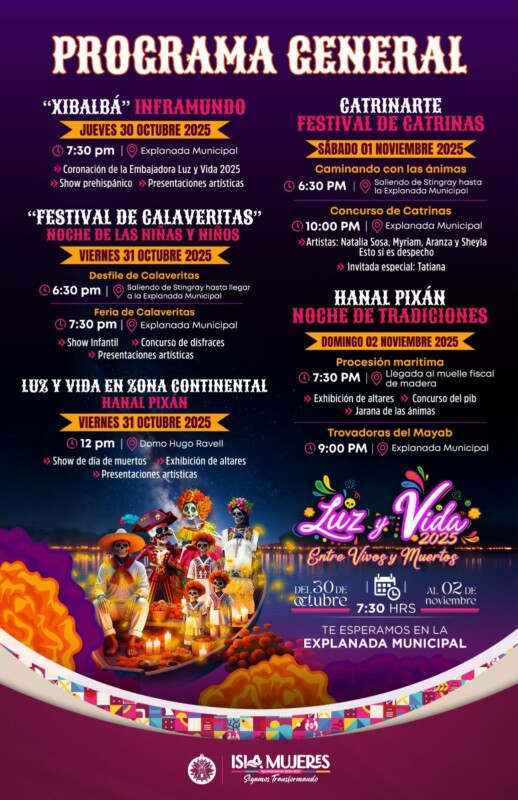 El Gobierno de Isla Mujeres, encabezado por la Presidenta Municipal, Atenea Gómez Ricalde, dio a conocer el programa del Festival “Luz y Vida: Entre Vivos y Muertos”, un espacio cultural diseñado para celebrar y preservar tradiciones y promover la cultura isleña en todas sus expresiones en el marco del Día de Muertos.
