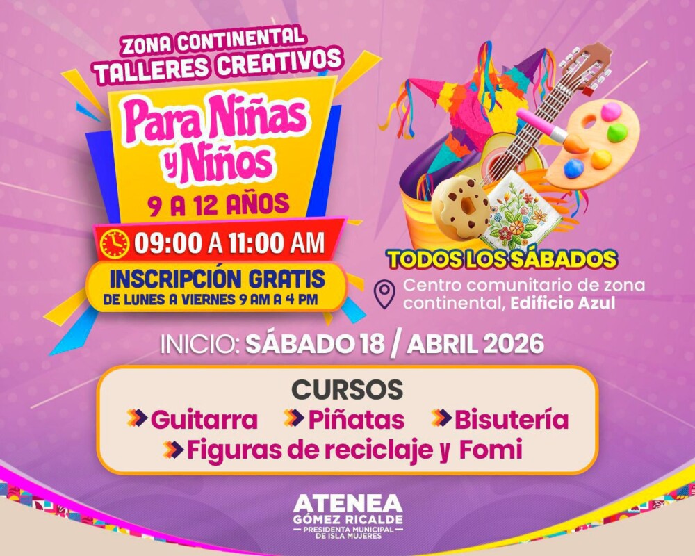 Isla Mujeres.– Con el objetivo de fomentar el desarrollo integral de la niñez isleña, el Gobierno Municipal que encabeza la Presidenta Municipal, Atenea Gómez Ricalde, anunció la apertura de talleres creativos dirigidos a niñas y niños de entre 9 y 12 años en la Zona Continental.