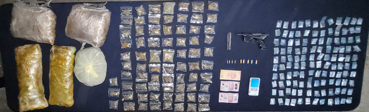 También se les encontró en posesión de 120 bolsitas con una sustancia con las características de la droga denominada cocaína, así como un teléfono celular y una pistola presumiblemente calibre .22, abastecida con cuatro cartuchos útiles y cinco cartuchos mas calibre 9 mm.