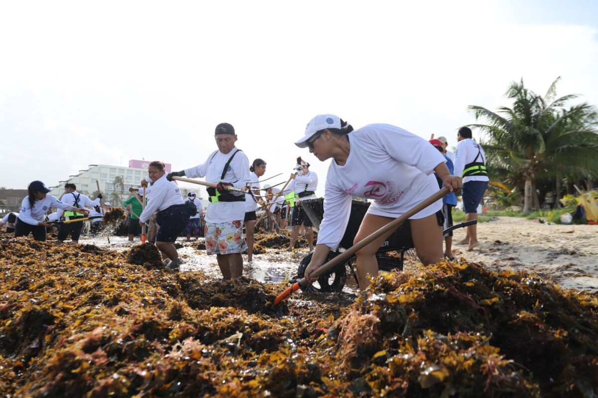 Isla Mujeres.- En respuesta al desafío del arribo atípico del sargazo en Isla Mujeres, el Gobierno Municipal que encabeza la alcaldesa Atenea Gómez Ricalde, continúa sumando esfuerzos para atender esta contingencia que inició desde ayer y donde se han retirado más de 150 toneladas de esta alga marina.