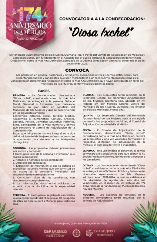 El próximo 17 de agosto, Isla Mujeres celebrará el 174 aniversario de su fundación y como ya es costumbre, en ese marco, serán entregadas las medallas al Mérito Turístico “Lic. José de Jesús Lima Gutiérrez”, al Mérito Ciudadano “Don Alfonso Ríos Azueta” y a la condecoración como la más alta distinción “Diosa Ixchel”.