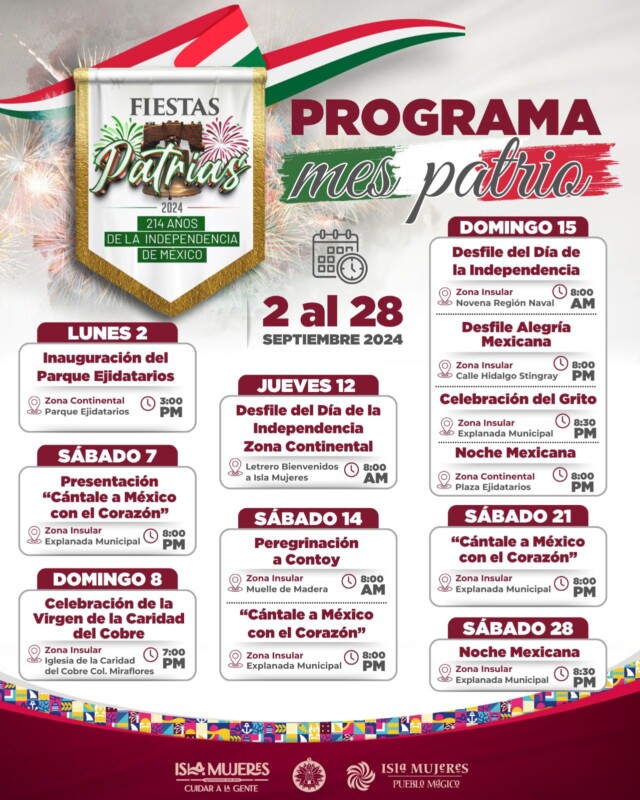 El jueves 12 de septiembre se llevará a cabo el Desfile del Día de la Independencia en la Zona Continental a las 8:00 horas, saliendo del letrero de Bienvenidos a Isla Mujeres, mientras que el sábado 14 de septiembre se realizará la Peregrinación a Contoy a las 8:00 horas, saliendo del Muelle de Madera y a las 20:00 horas se llevará a cabo el concurso “Cántale a México con el Corazón” en la Explanada Municipal.