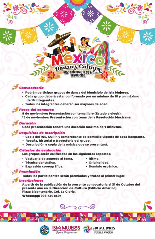 Con el objetivo de preservar las tradiciones, fortalecer la identidad nacional e impulsar el talento artístico local, el Gobierno de Isla Mujeres, encabezado por la Presidenta Municipal, Atenea Gómez Ricalde, abrió la convocatoria del concurso “México Danza y Cultura, 215° Aniversario de la Revolución”.