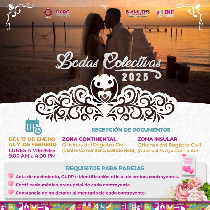 Para facilitar el proceso, las parejas podrán acudir en la Zona Continental a las Oficinas del Registro Civil, ubicadas en el Centro Comunitario del Edificio Rosa. Mientras que, en la Isla podrán acudir a las Oficinas del Registro Civil, a espaldas del H. Ayuntamiento.
